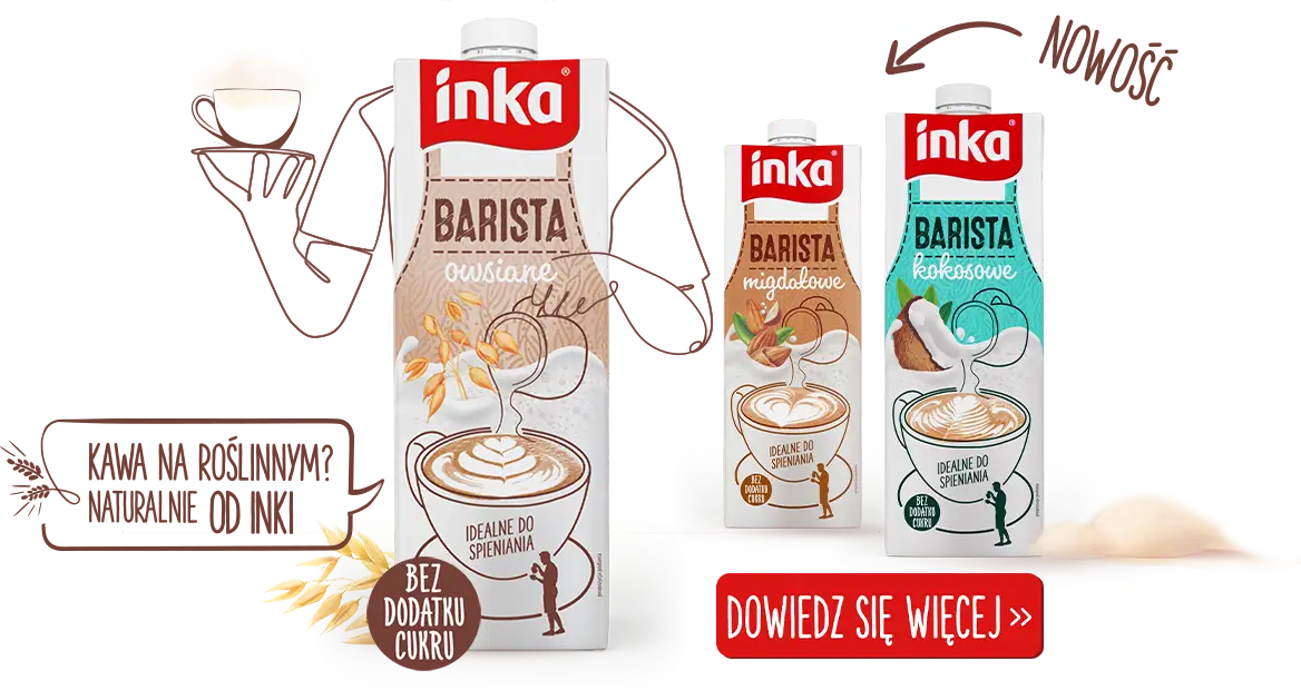 Na śniadanie, obiad, kolację. Na deser i podwieczorek. Inka jest dobra na każdą porę dnia. Marzysz o chwili dla siebie? Chcesz zaskoczyć bliskich roślinnym deserem, albo naturalną kawą zbożową w niepowtarzalnym wydaniu? A może szukasz pomysłu na wykorzystanie sezonowych owoców i warzyw? Puść wodze fantazji, zainspiruj się wyjątkowym smakiem naszych kaw zbożowych oraz napojów roślinnych i odtwarzaj sprawdzone przepisy każdego dnia. A może stworzysz swój własny?