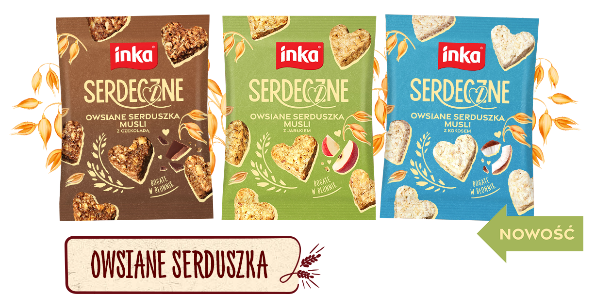 „Serdeczne” od kultowej marki Inka to owsiane serduszka musli z pysznymi dodatkami: czekoladą, kokosem, jabłkiem. Łączą przyjemne z pożytecznym, znajdując zastosowanie jako pyszny odżywczy posiłek lub zdrowsza słodka przekąska w drodze, czy smakołyk do kawy i herbaty. Wspaniale wpisują się w zbożowe DNA Inki i esencję marki, która jest dobra w swej naturze.