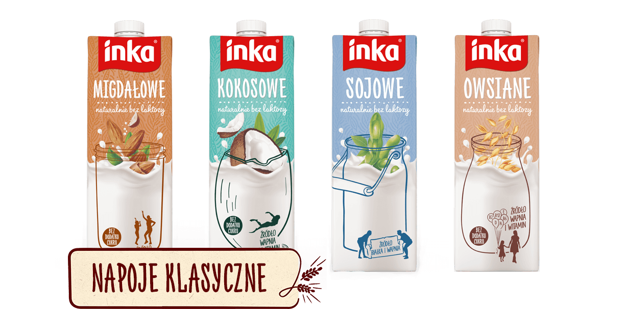Klasyczną linię napojów roślinnych od Inki tworzą: Owsiane, Sojowe, Ryżowe, Migdałowe i Kokosowe.